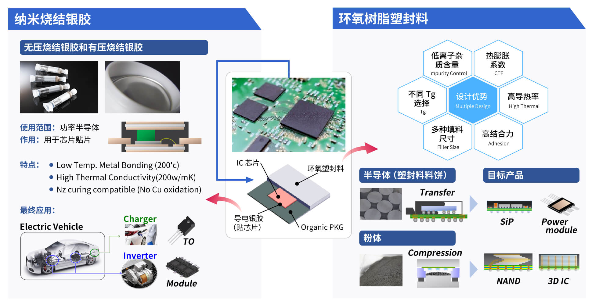 塑封材料同样有针对第三代碳化硅,氮化钾的芯片的高耐热的产品,可以让器件在200度的高温度下长期工作。以及针对智能汽车相关的其他的高可靠性的车规级塑封材料,如存储芯片,SIP封装等相关车规级塑封材料。