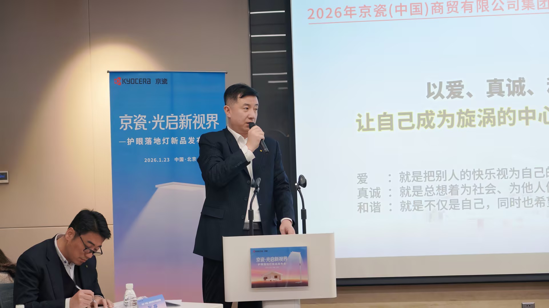 1月23日,京瓷(中国)商贸有限公司护眼落地灯新品发布会在北京圆满举行。京瓷以“漫反射均匀光+紫光激发全光谱光源”为核心技术,正式推出旗下首款护眼落地灯KF-001WH。发布会以“京瓷·光启新视界”为主题,聚焦健康照明趋势,汇聚行业专家、战略合作伙伴及主流媒体,围绕光健康科技创新与产业发展展开深入交流,共同见证京瓷在健康照明领域的技术创新。